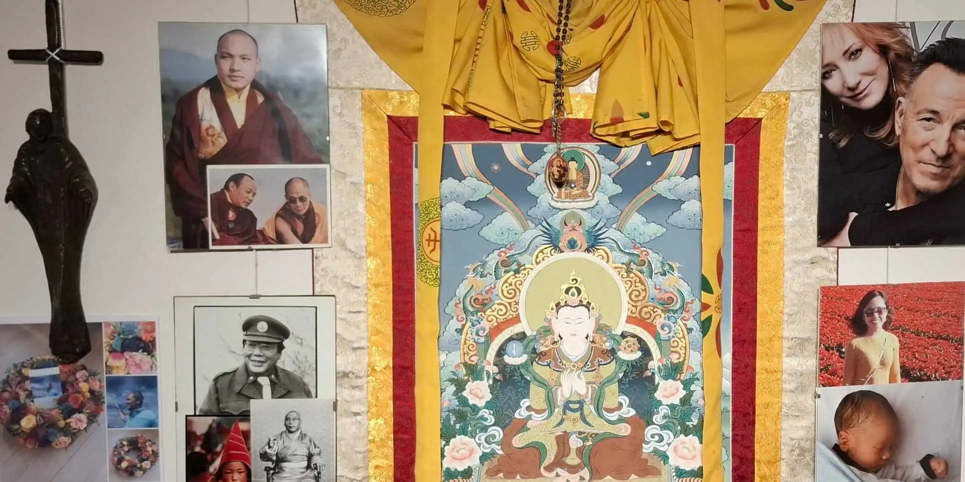 Sinds vandaag heb ik links op mijn meditatie-schrijn een kruis en een fotocollage, die beiden van mijn vader (Bernard) waren. Op de collage staat de rouwkaart van zijn oudste zoon (mijn grote broer dus), terwijl de krans door mijn zussen, jongere broer en mij was aangeboden op Floris’ uitvaart. Na donderdag tot diep in de nacht te hebben gesjouwd en gepoetst, leverden we papa’s appartement gisteren op.